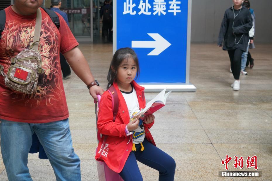 10月1日,小女孩在北京南站内候车时看书。当天是国庆假期首日,北京南站迎来客流高峰。此前,据北京铁路局预计,国庆黄金周将发送旅客1168万人,同比增加19.9万人。其中10月1日为出行高峰日,预计当天发送旅客143万人,同比增加4.7万人。中新社记者 张兴龙 摄