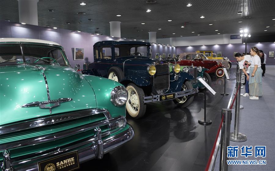 10月1日,市民在西安曲江国际会展中心内观看展示的老爷车。