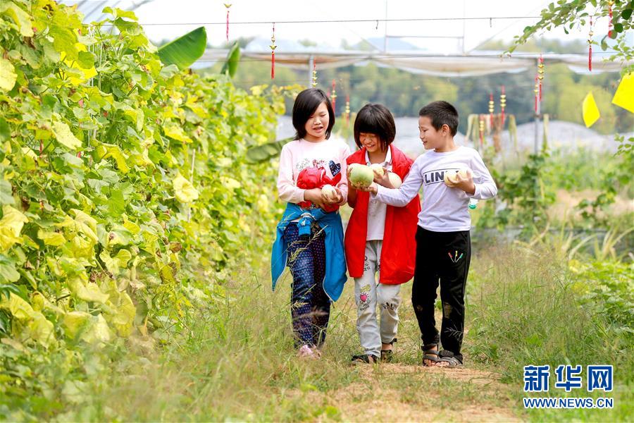 10月1日,小朋友在江西省吉安市峡江县现代农业科技示范园的瓜棚里采摘甜瓜。