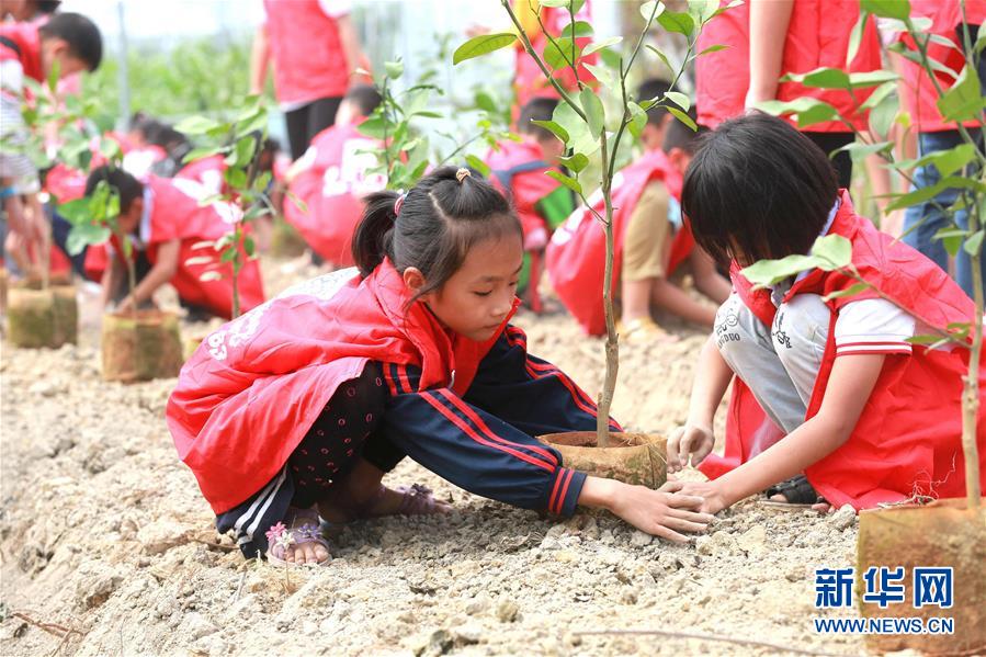 10月1日,小朋友在江西省吉安市峡江县现代农业科技示范园栽种自己认领的果树苗。