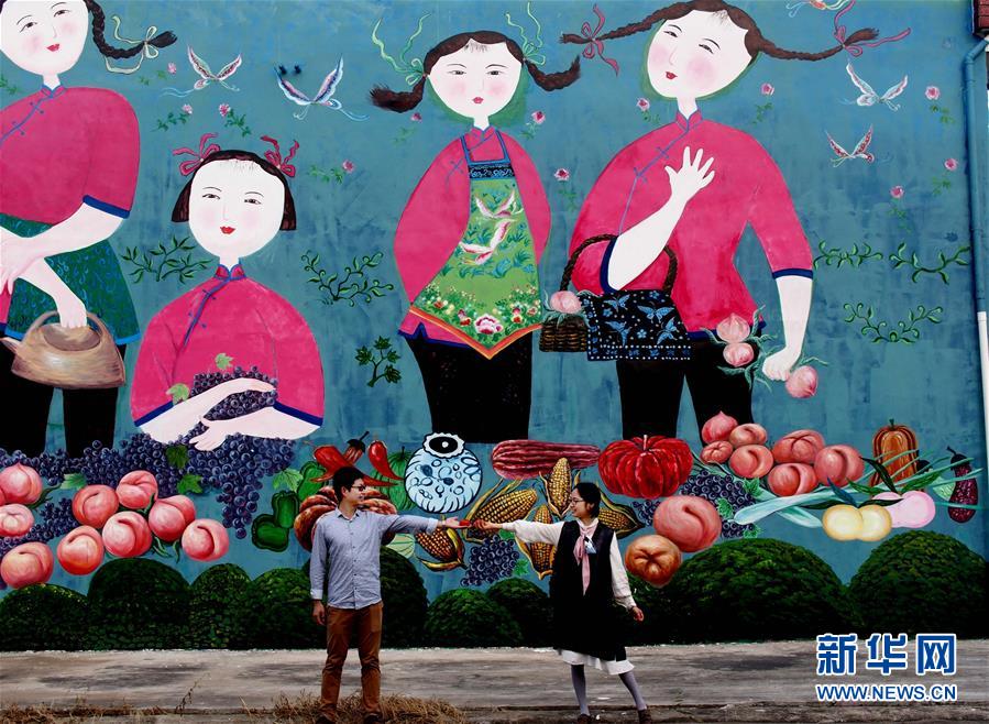 10月1日,游人在和平村的民居壁画前留影。 新华社记者 任珑 摄