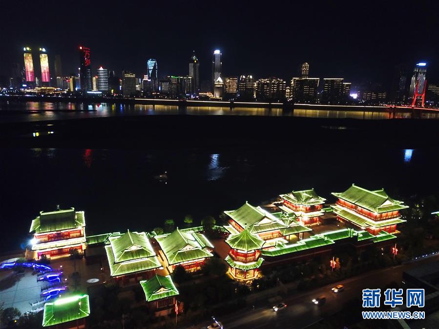 这是10月1日无人机拍摄的南昌市赣江两岸的灯光景观。 国庆假期期间,江西省南昌市区赣江两岸建筑开启灯光秀,给节日的南昌增添喜庆气氛。 新华社记者 胡晨欢 摄