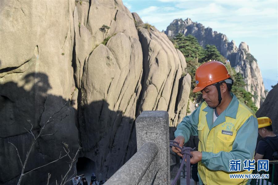 10月1日,李培生在黄山风景区玉莲新道附近进行放绳作业。 李培生是安徽黄山风景区玉屏环卫所的一名放绳工,他常年肩挎登山绳攀爬在悬崖峭壁间清理垃圾或帮助游客捡拾失物,在责任区内与同事一道巡查清捡。像李培生这样的放绳工,整个黄山风景区有18人,他们用辛勤的汗水守护着黄山的美丽,成为黄山一道独特的“风景”。 新华社记者 张端 摄