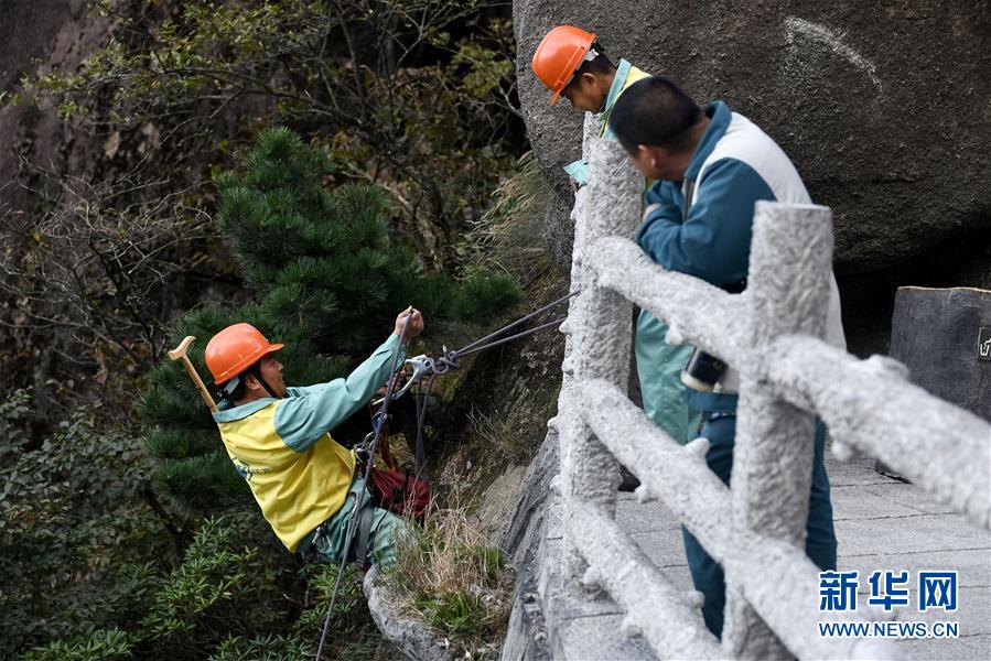 10月1日,李培生(左)在黄山风景区一处悬崖峭壁间清捡完垃圾之后收绳。 李培生是安徽黄山风景区玉屏环卫所的一名放绳工,他常年肩挎登山绳攀爬在悬崖峭壁间清理垃圾或帮助游客捡拾失物,在责任区内与同事一道巡查清捡。像李培生这样的放绳工,整个黄山风景区有18人,他们用辛勤的汗水守护着黄山的美丽,成为黄山一道独特的“风景”。 新华社记者 张端 摄