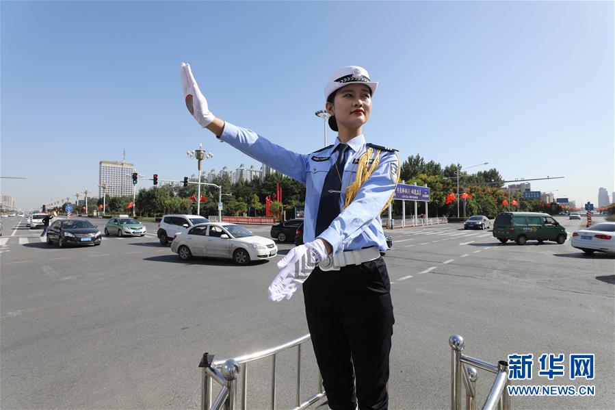 10月1日,河北省邯郸市一名女交警在街头执勤。 当日是国庆节,各行各业的很多工作人员仍坚守岗位,在忙碌中度过节日。 新华社发(韩超 摄)