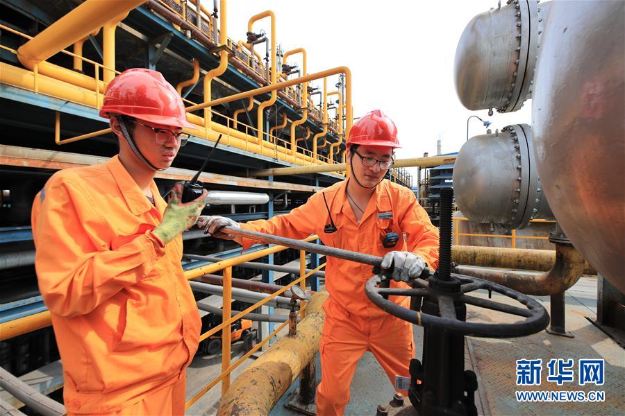 10月1日,两名工人在江苏新海石化有限公司操作阀门螺栓。 当日是国庆节,各行各业的很多工作人员仍坚守岗位,在忙碌中度过节日。 新华社发(司伟 摄)