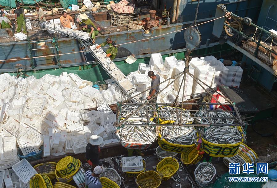 10月2日,在福建省石狮市祥芝国家中心渔港,靠岸渔船上的渔民将渔获用起重机吊上岸。 新华社记者 宋为伟 摄