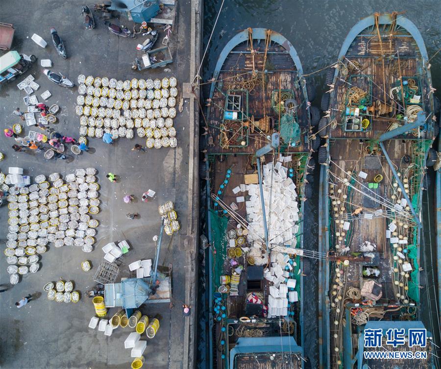10月2日,在福建省石狮市祥芝国家中心渔港,靠岸渔船上的渔民将渔获运送上岸(无人机拍摄)。 新华社记者 宋为伟 摄