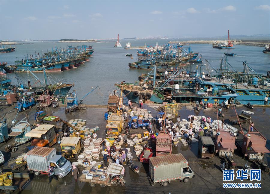 10月2日,渔民在福建省石狮市祥芝国家中心渔港运送渔获(无人机拍摄)。 新华社记者 宋为伟 摄