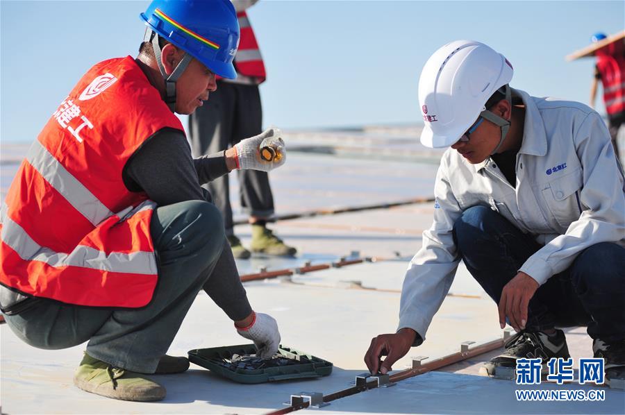 10月2日,北京建工集团的施工人员在进行指廊屋面施工。 新华社发(祖戈 摄)