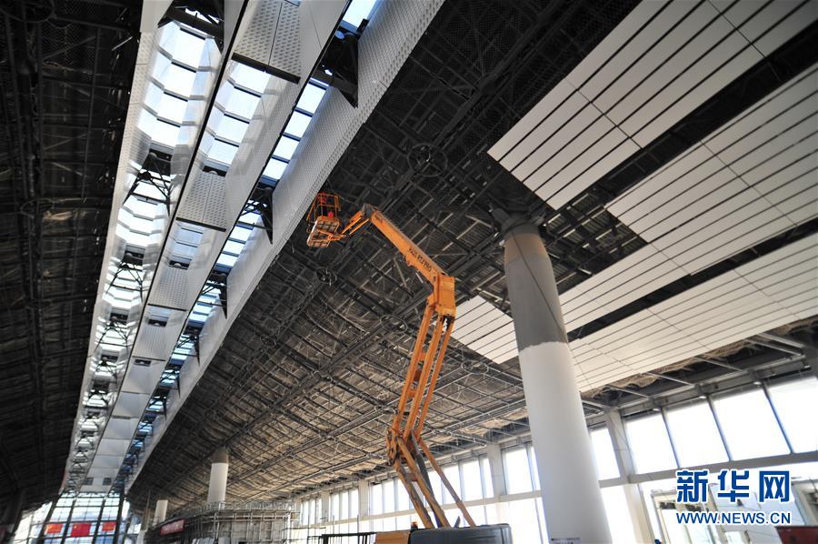 10月2日,北京建工集团的施工人员在进行指廊内部精装施工。 新华社发(祖戈 摄)