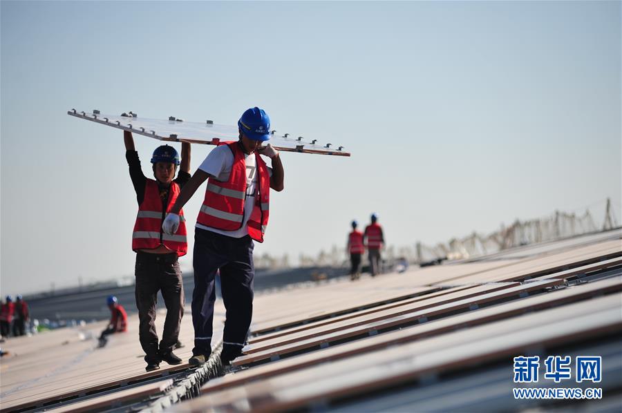 10月2日,北京建工集团的施工人员在进行指廊屋面施工。 新华社发(祖戈 摄)