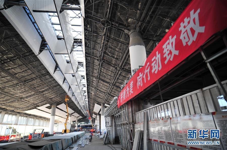 10月2日,北京建工集团的施工人员在进行指廊内部精装施工。 新华社发(祖戈 摄)