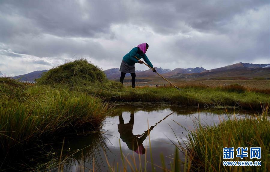 西藏当雄县宁中乡的牧民在收割牧草(10月2日摄)。