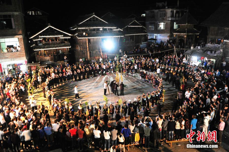 比赛当天,侗族“寨花”精心打扮,带着家中油灯“陪更”,在鼓楼坪围成一圈排开,面朝鼓楼坪中央,而小伙子们在阿妹围成的大圆圈中表演,小伙子们一步一个回头,在斗芦笙过程中与侗族阿妹产生感情而定下终身。蒋雪林 摄