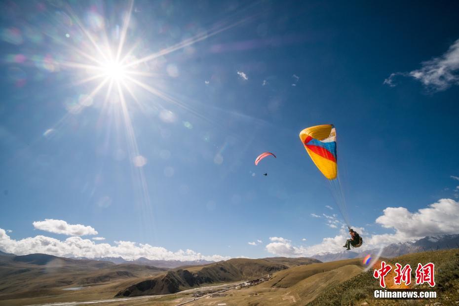 西藏羊八井,运动员在滑翔伞比赛中。中新社记者 何蓬磊 摄