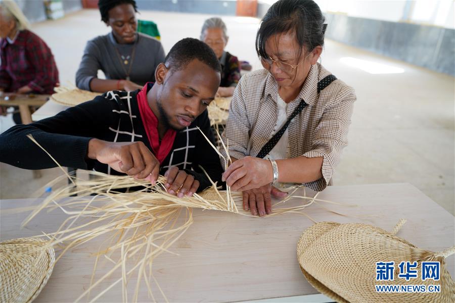 10月3日,在江西新余学院就读、来自赞比亚的姚明(前左)等留学生,在新余市渝水区人和乡学习手工蒲扇的编织。