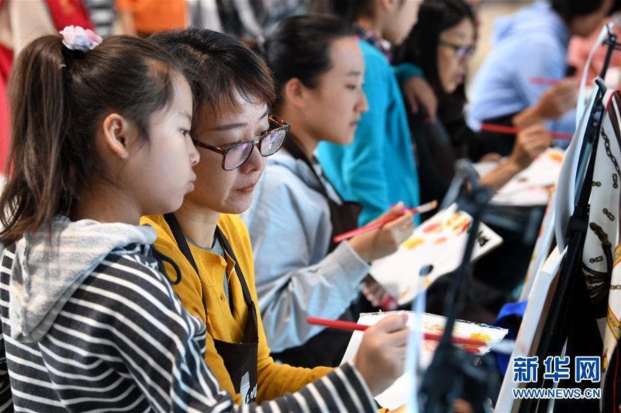 10月3日,在山西太原市图书馆,市民在参加油画课程。 新华社记者 杨晨光摄