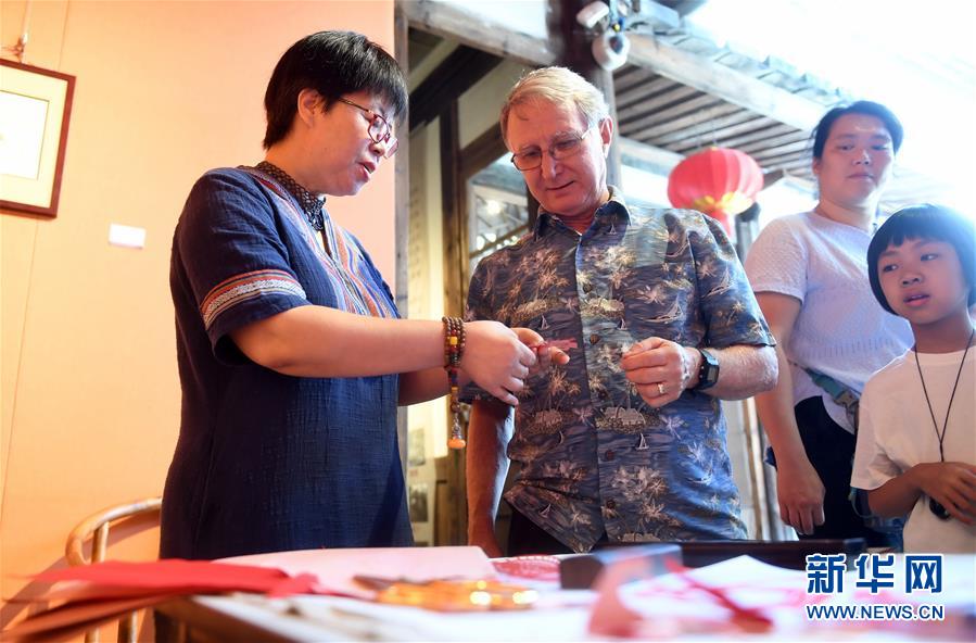 10月3日,在福建福州三坊七巷举行的非遗剪纸展上,福州杨桥中学英语老师潘力鹰(左)在向美国客人讲解中国的民间剪纸艺术。 新华社记者 林善传摄