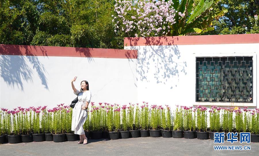 10月3日,在江西省南昌市青云谱区八大山人梅湖风景区,一名游客在景区内自拍。 新华社记者 胡晨欢摄
