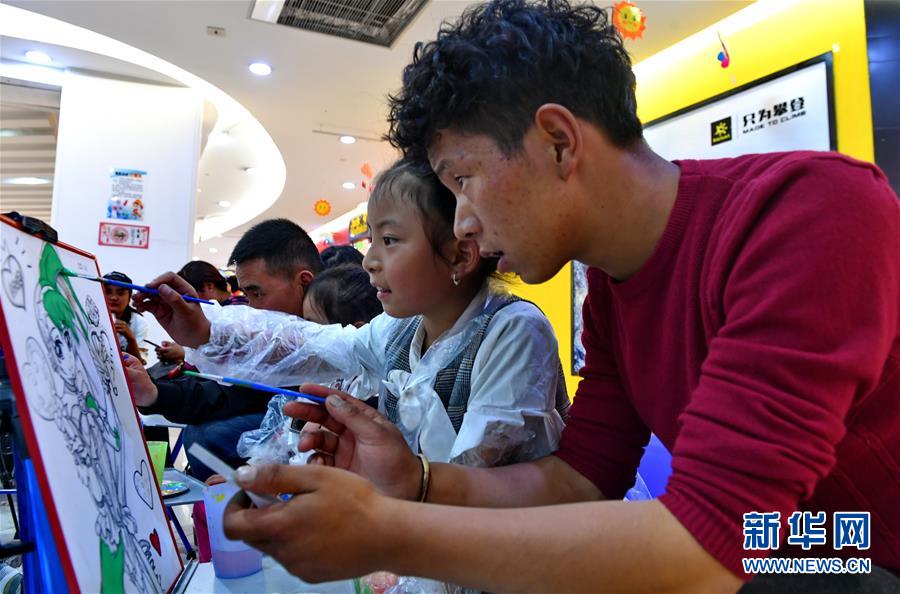 在拉萨市神力时代广场,一位家长和孩子在一起画画(10月2日摄)。
