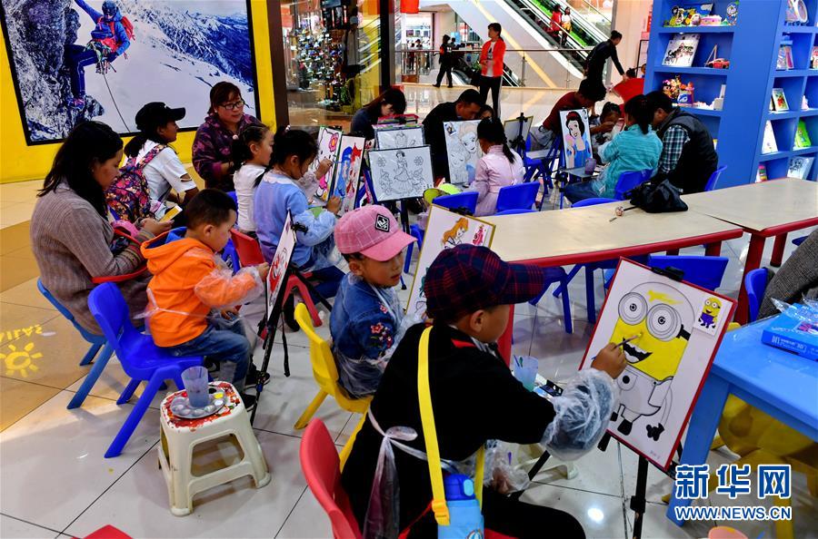 在拉萨市神力时代广场,家长陪伴孩子画画(10月2日摄)。新华社记者 张汝锋 摄