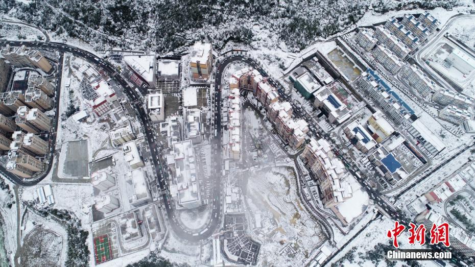 空中俯瞰雪后的康定城区,道路上排满了通行的小车。刘忠俊 摄