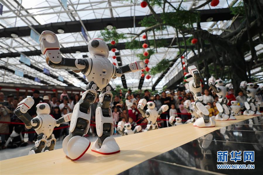 10月3日,人们在丝路小镇科技馆观看“机器人跳舞”。