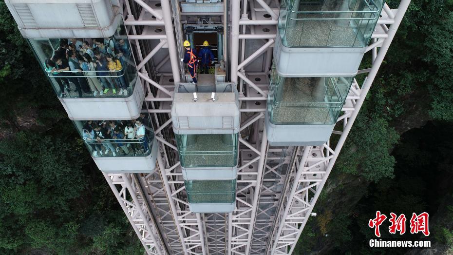 国庆黄金周期间,湖南张家界武陵源风景区内的重要游览运输工具——张家界百龙天梯,日均游客接待量超过2万人次。当游客乘坐这部垂直高差355米的悬崖户外电梯在峰林间上下穿行时,电梯巡检工仍坚守在岗位上,在电梯的钢架或吊厢上反复对缆绳、吊厢进行现场巡检,及时清理缆绳、钢架上的树叶、杂物等,排除一切可能存在的隐患。吴勇兵 摄