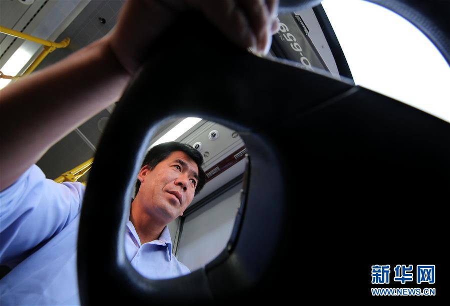 10月4日,在河北省武安市,一名公交司机驾驶公交车行驶在街头。 新华社记者 王晓 摄