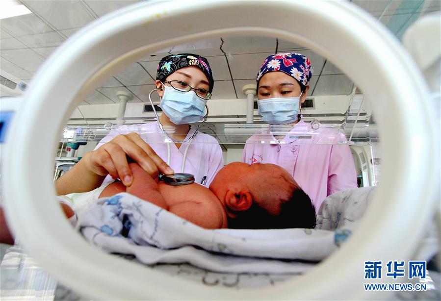 10月4日,在河北省武安市第一人民医院新生儿科,医护人员为一名婴儿做检查。新华社记者 王晓 摄