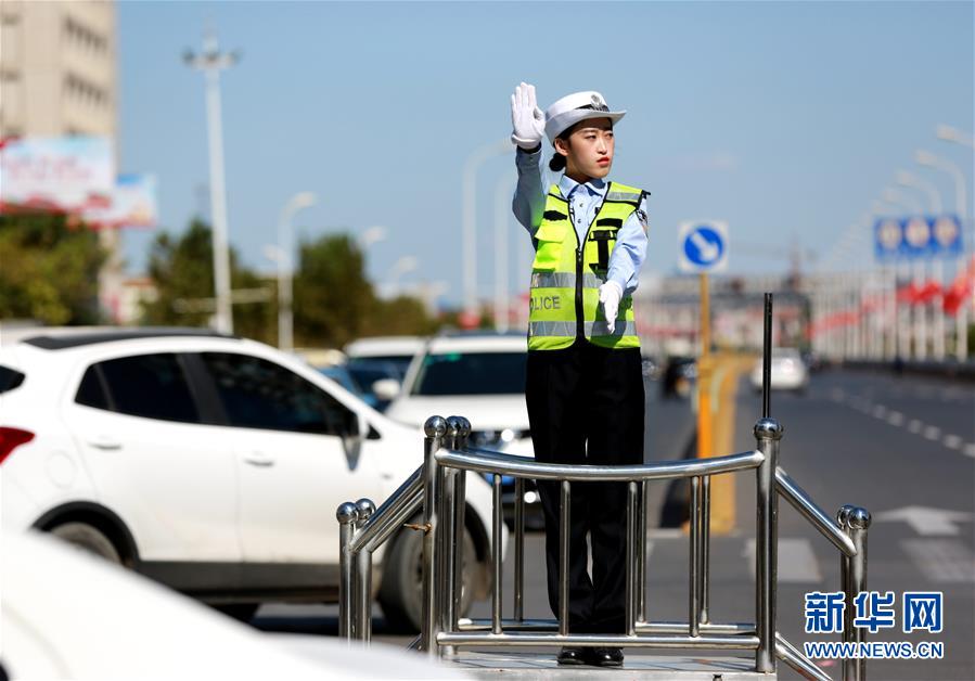 10月4日,河北省武安市公安交通警察大队城区中队民警在指挥交通。新华社记者 王晓 摄