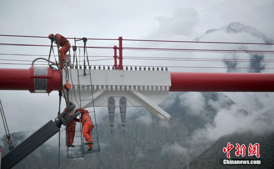 工人师傅正在安装连接杆,大桥不远处就是雪山。中新社记者 刘忠俊 摄