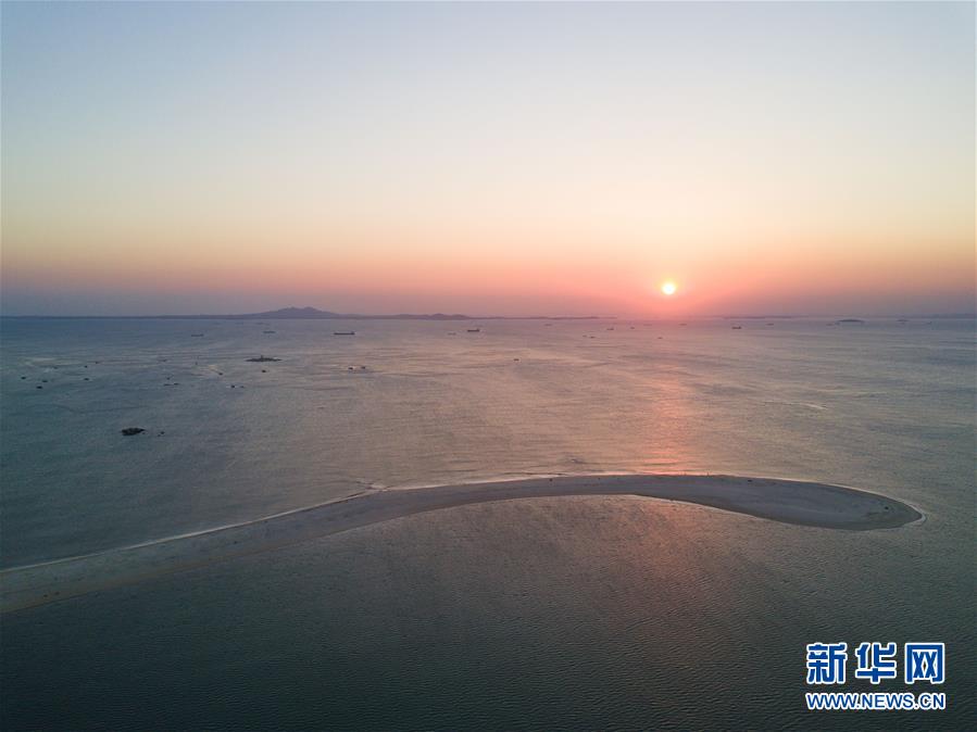 在福建省晋江市金井镇塘东村,涨潮时的海上沙堤在落日余晖中美不胜收(10月4日无人机拍摄)。新华社记者 宋为伟 摄