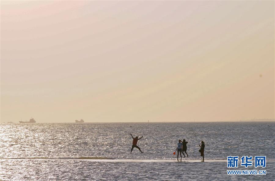 10月4日,游客在福建省晋江市金井镇塘东村海上沙堤留影。新华社记者 宋为伟 摄