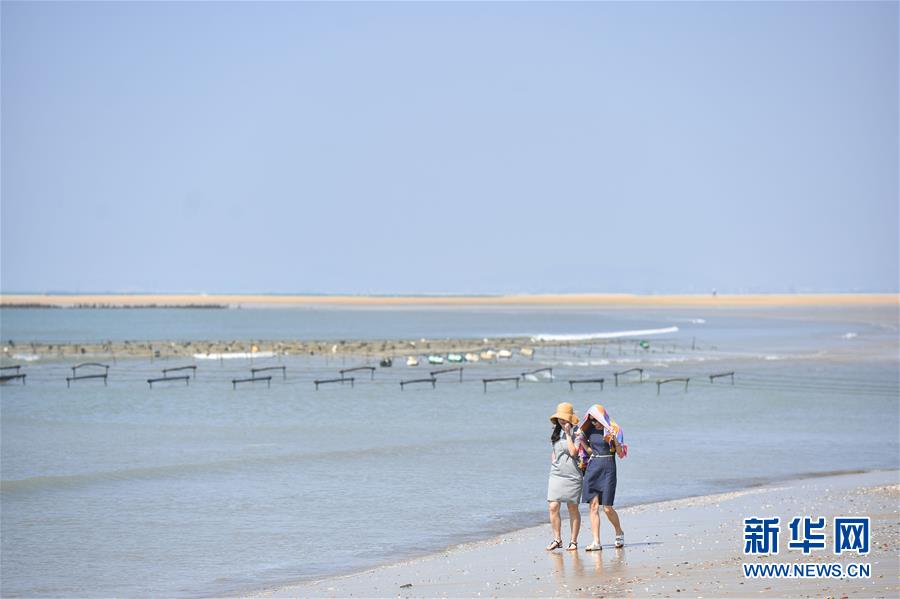 10月4日,游客在福建省晋江市金井镇塘东村海上沙堤游览。新华社记者 宋为伟 摄