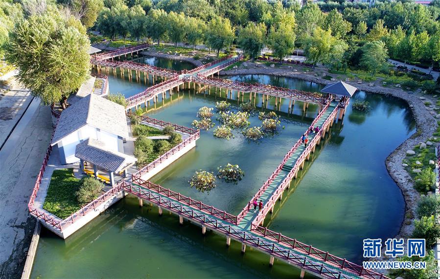 10月5日,人们在文园内的人工湖参观游览(无人机拍摄)。 位于河北省唐山市乐亭县县城北部的文园曾经是一片堆积建筑垃圾的废弃荒地。近年来,乐亭县按照“景观秀美、绿量充足、传承文脉、便利休闲”的规划定位,通过开挖园湖、遍植树木、修建具有浓郁地方特色的民俗文化景观,把过去的废弃荒地建成了一座风光秀美的生态文化公园,成为市民和游客休闲游玩的好去处。 新华社记者 牟宇 摄