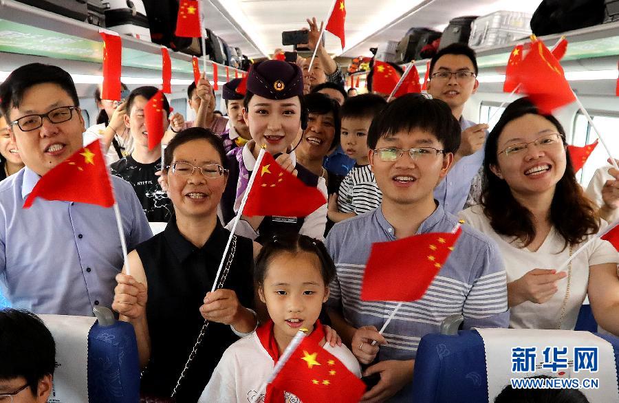 10月1日,在上海虹桥开往贵阳北的G1329次列车上,乘务员和旅客合唱《歌唱祖国》,欢度国庆。 新华社记者 陈飞 摄