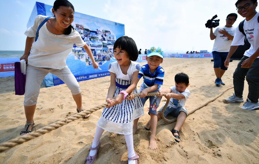 10月1日,在海口市假日海滩,小朋友在2018海南亲水运动季国庆亲水运动嘉年华上参加沙滩拔河比赛。 新华社记者 郭程 摄