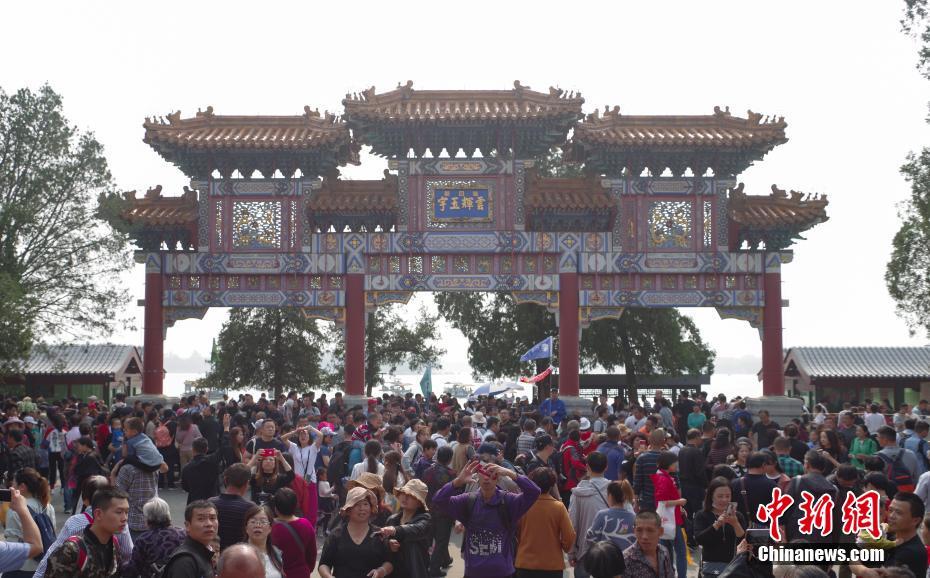 10月5日,国庆长假已经过半,北京颐和园内游客众多。当日,北京市旅游委发布数据,全市重点监测的176家旅游景区,接待游客212.1万人次,同比减少3%;营业收入7139.6万元,同比下降2.5%。中新社记者 贾天勇 摄