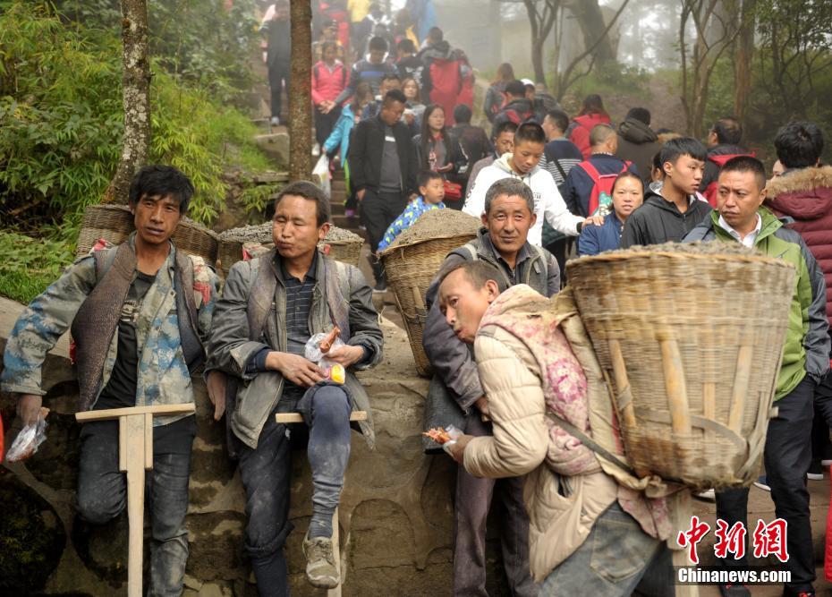 10月5日,海拔3000多米的峨眉山金顶,一些山道阶梯、宾馆正在维修,因无法使用机械,背山工们一次要背200斤左右的建材步行一公里的上行山道,每天往返10余趟将建筑材料送到工地。图为峨眉山金顶游道边上小憩的背山工们。中新社记者 刘忠俊 摄