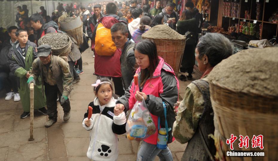 10月5日,海拔3000多米的峨眉山金顶,一些山道阶梯、宾馆正在维修,因无法使用机械,背山工们一次要背200斤左右的建材步行一公里的上行山道,每天往返10余趟将建筑材料送到工地。图为峨眉山金顶人群中穿行的背山工。中新社记者 刘忠俊 摄