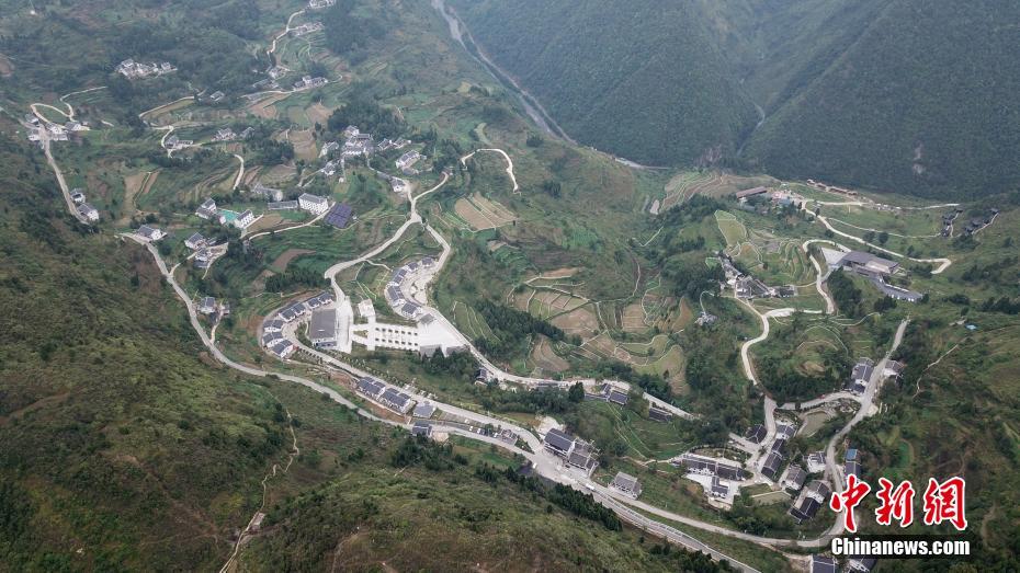 10月5日,航拍大发渠所在地团结村草王坝。当日,国庆黄金周期间,位于贵州省遵义市播州区平正乡的大发渠吸引了众多游客前来旅游观光。大发渠是当地老支书黄大发历时36年带领当地村民过三道绝壁开凿出来的水渠。而今,在贵州金融企业的帮扶下,大发渠和其所在地草王坝经过重新改造利用,已经从“救命”水渠转变为农旅融合发展的“致富”金渠。中新社记者 瞿宏伦 摄