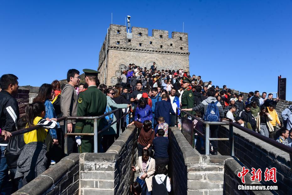 10月6日,国庆假期进入尾声,北京八达岭长城游人依然众多。图为八达岭长城北八楼前游人众多。