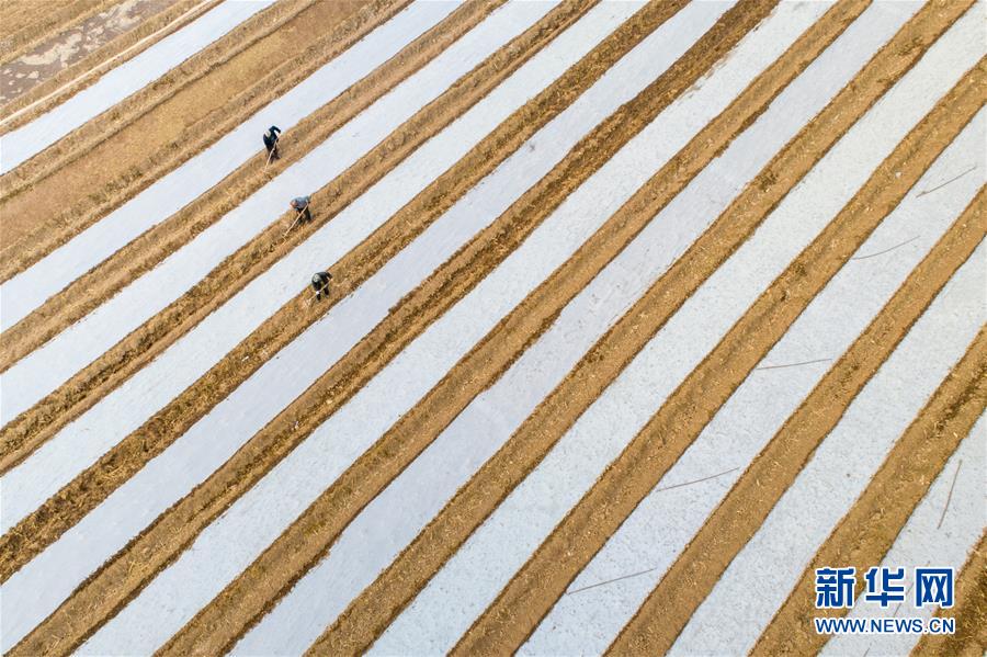 10月8日,山东淄博高青县花沟镇的农民在播种大蒜(无人机拍摄)。