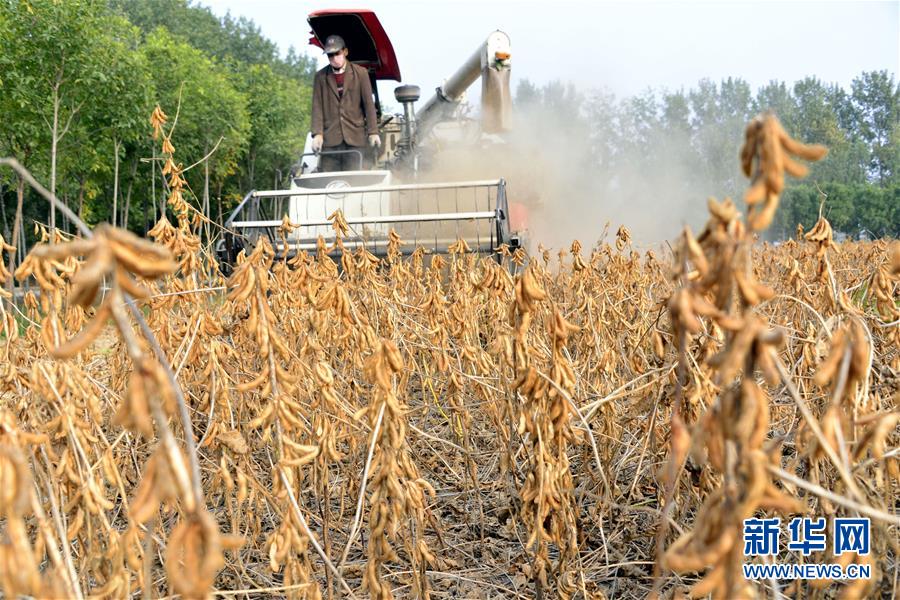 10月8日,农民利用收割机在贾寨镇后寨村田间收割大豆。 金秋时节,山东省聊城市茌平县贾寨镇的一家家庭农场托管种植的1200多亩大豆进入成熟收获期,工人们忙着收获、晾晒、烘干大豆。据悉,该镇的家庭农场通过土地托管的方式进行经营管理,推广农业种植新技术,带动周边村民增产、增收。 新华社发(赵玉国 摄)