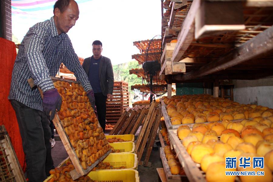 10月10日,在广西桂林恭城瑶族自治县恭城镇化育村,农民将柿饼装筐准备外销。 新华社发(郑智敏 摄)