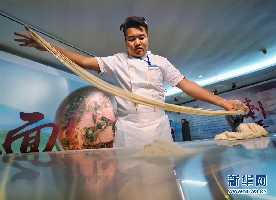 10月11日,一名来自循化县的厨师在展示拉面技艺。