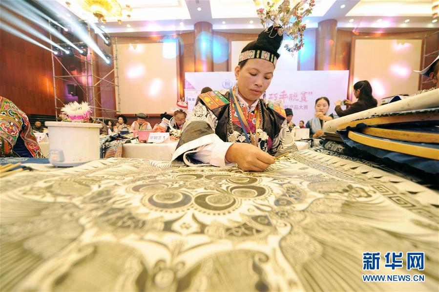 10月11日,参赛选手在比赛现场制作蜡染。 当日,“圆梦锦绣·巧手脱贫”贵州省妇女特色手工技能暨创新产品大赛在贵阳市举行。来自贵州省各地的参赛选手分别就民族刺绣、民族蜡染、创新产品设计等进行现场比拼。 2013年,贵州省启动“锦绣计划”,促进妇女实现家门口就业创业、脱贫致富。“锦绣计划”实施五年来,培训妇女6.5万人次,帮助全省众多妇女织就脱贫致富路。 新华社发(杨文斌 摄)