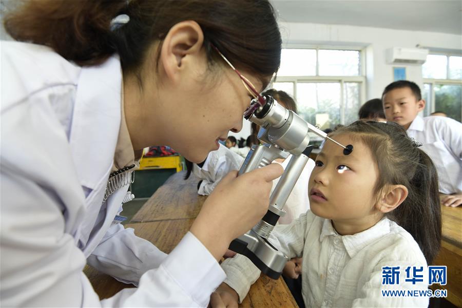 10月11日,在河北省故城县郑口第三小学,故城县医院眼科医生在为学生检查眼睛。 当日是世界视力日。河北省故城县开展“保护视力 从小做起”主题公益活动,组织医务人员前往学校给孩子们检测视力、普及爱眼护眼知识,使孩子们从小养成爱眼护眼的好习惯。 新华社记者李晓果摄